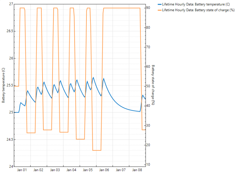 The output battery temperature is now very (to) close to 25C in all time steps which is still surprising since during charging or discharging, the battery temperature is supoosed to exceed its environment due to internal heating.