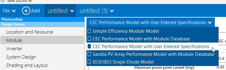 Click the Copy specifications from currently selected module in CEC database to copy the parameters.