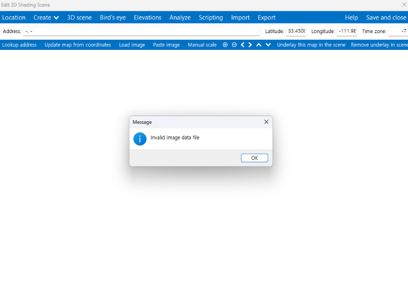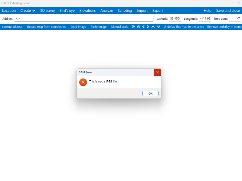 On July 13, 2025, the Update map from coordinates feature in the 3D Shade Calculator began showing an error after entering valid latitude and longitude values.The system version is SAM 2025.4.16.
