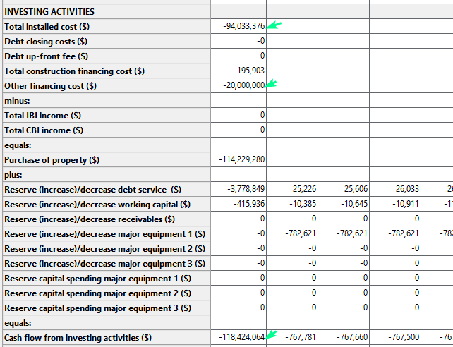as far as financials, i mentioned this before. VC's don't charge interest just a flat fee and a ten-year payback period and it doesn't' seem that your system can accommodate this scenario. maybe it can but i can't figure it out. So, put the 20 mil in "Cost of Acquiring Financing" and the total Install cost that it comes up with $94 mil isn't visible in the cash flow financial and neither is the Net Capital Cost of $118 mil