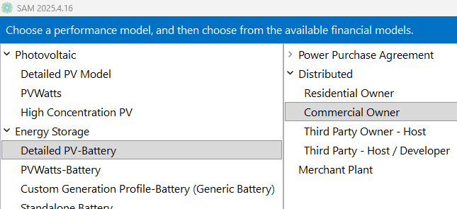 3. Choose the Detailed PV performance model and the Commercial Owner financial model. Be sure to choose the same financial model as the one in the original case to preserve the financial model inputs.