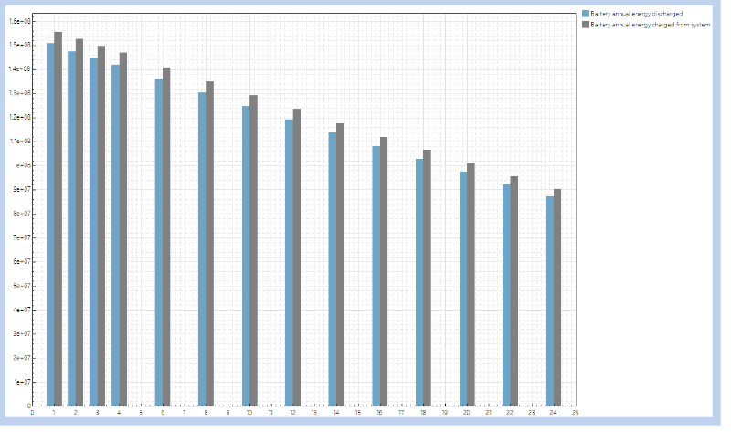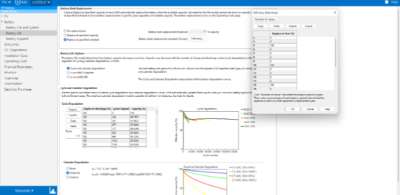 In SAM (System Advisor Model), my battery stops discharging in certain years (for example years , 7, 9, 11, etc.). i am using "Replace at specified schedule" mode in the Battery Life settings. The annual battery discharge becomes zero for those years.Why does this happen, and what is the correct way to configure the battery replacement so that the system continues operating every year?