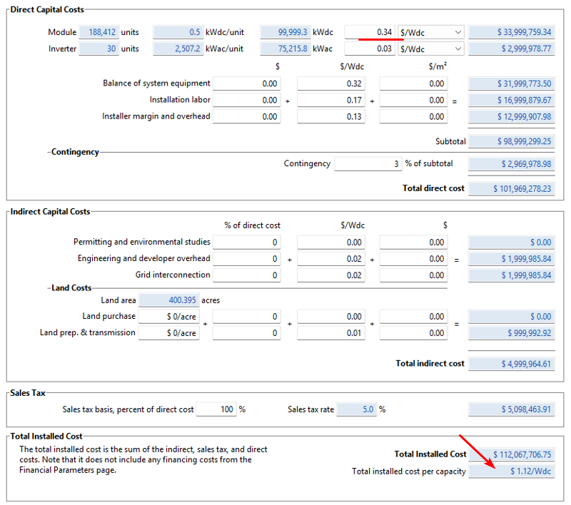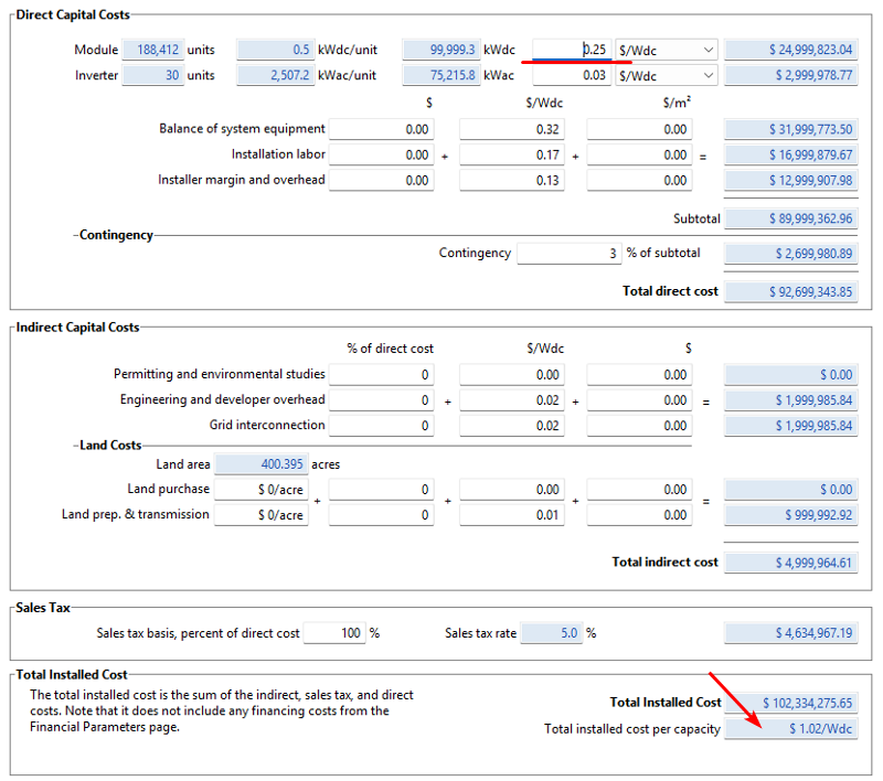 If you change the module cost, for example, to $0.25/Wdc, the total installed cost changes to $1.02/Wdc: