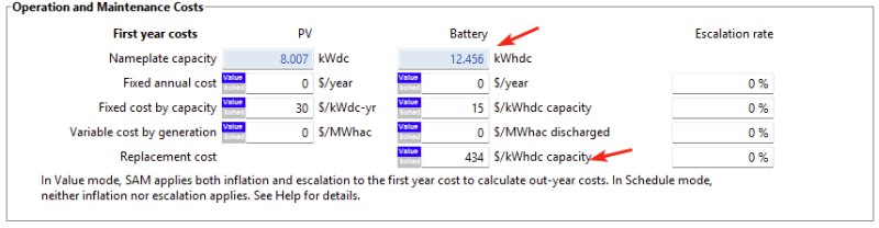 For configurations with battery storage, you can set the battery replacement cost in $/kWhdc of battery capacity on the Operating Costs input page.
