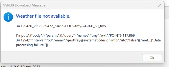 Hi, I am having issues downloading weather files through SAM. This error started about a week ago. Every try results in an "Error message from NSRDB: Data processing failure."