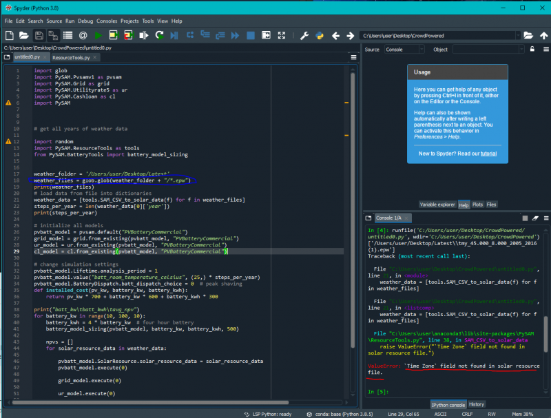 Attached you can find an image of my code which was taken from the PySAM tutorial, and the ResourceTools section that is causing the problem in my code.