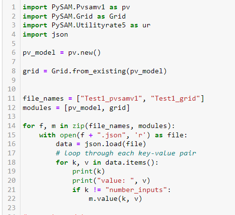 Attached is a zip file that I created from a default Detailed PV / No Financial case in SAM. It includes the json input files for the Pvsamv1 and Grid modules, a weather file, and a sample Python script that runs a simulation.
