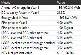 PySAM results ---------------------- PV capacity: 100.0 MW PV power: 186,487,766 kWh PV capacity factor: 21.3 % PV LCOE nominal: 4.9 c$/kWh