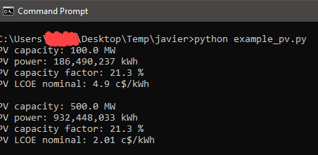 PySAM results ---------------------- PV capacity: 500.0 MW PV power: 932,435,679 kWh PV capacity factor: 21.3 % PV LCOE nominal: 2.01 c$/kWh