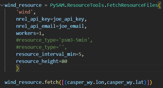 Thanks for your response. I tried your code, and copied it over below in case there is a mistake I am not seeing. I am still not able to get 5-minute profiles for wind. Is your tools object an instance of PySAM.ResourceTools? I'm assuming that the email and API key are working because it does download a weather profile, but even with the time set to 5 minutes, the file only contains 8760 data entries. Is there something else I might be missing?